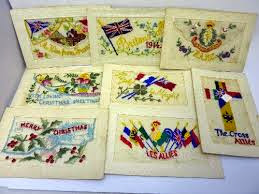 The most famous producer of these cards was T Stevens of Coventry, whose silk cards are so realistic that they resemble photographs. His range was huge, including flags, ships and clasped hands across the sea.